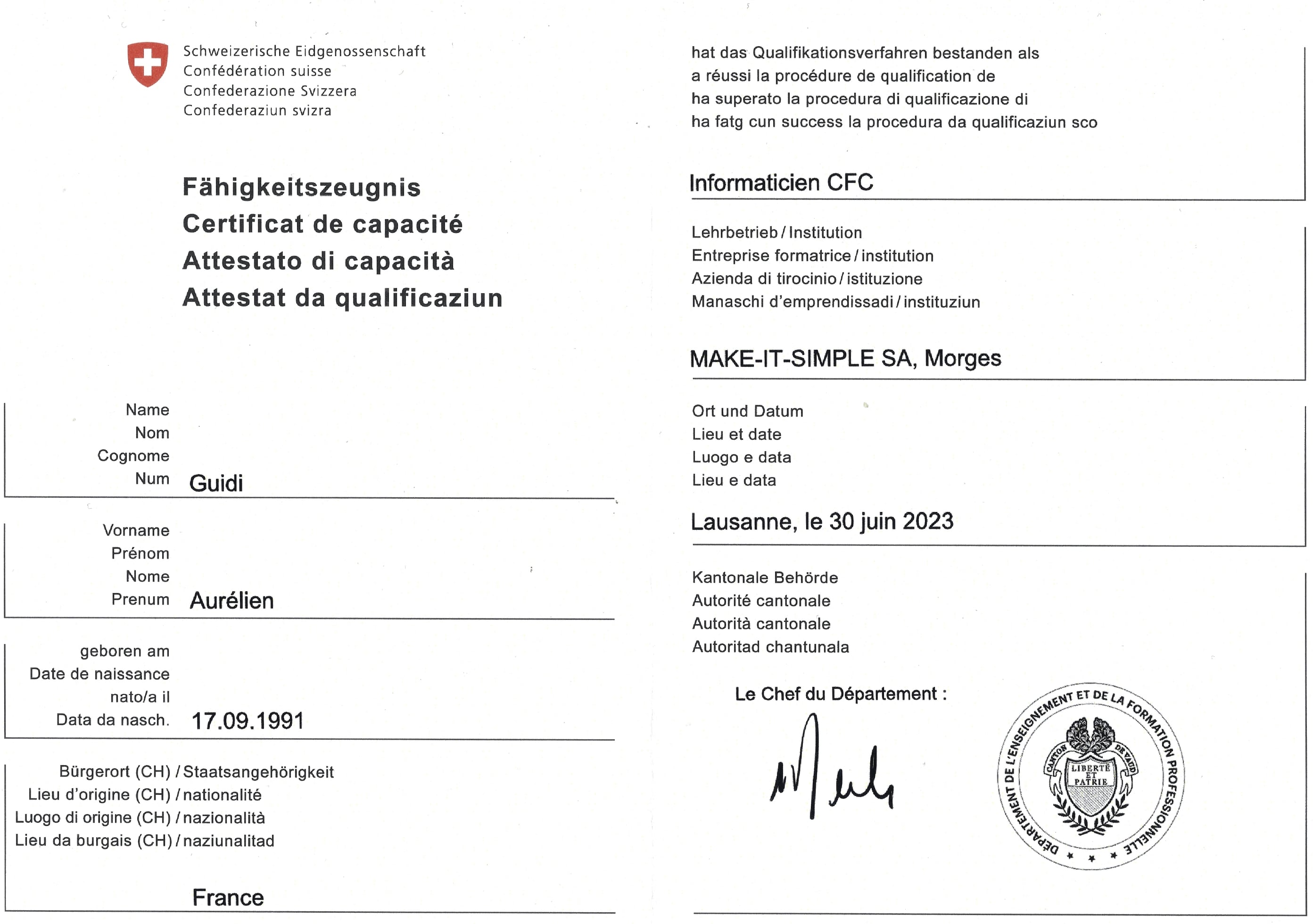 Mon CFC informaticien technique des systemes ainsi que mes diverses certifications me permettent d'avoir un profil generaliste avec des connaissances dans plusieurs domaines informatiques dont : les systemes (Windows/Linux) et les reseaux mais egalement la securite, la gestion de parc et la gestion d'incidences. Organise, dynamique et dote d'un grand sens de l'ecoute, mes qualites personnelles me donnent les capacites d'etre autonome mais egalement de travailler en equipe, ainsi que d'etre a l'aise avec le contact clientele. Etant passionne et soucieux d'etre a la pointe de l'actualite technologie, je desire faire un Brevet Federal en Cyber Security Specialist.